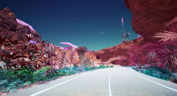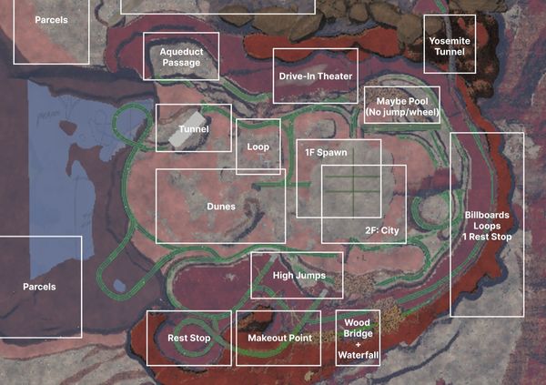 I also worked with the art team to create the Desert Driving spawn location located towards the center of the biome. I designed both the in-game spawn location and the system that allows players to spawn in or out of Desert Driving. I created design sheets as reference for what the spawn location should look like and documentation for the spawn system. I then used my design to blockout the spawn area before environment artists took over. I used blockout geometry to layout architecture and created the rotating platform, connecting tracks, cave structures and other elements. My design aimed to balance players' initial view of points of interest upon spawning, offering an intriguing glimpse without revealing too much.